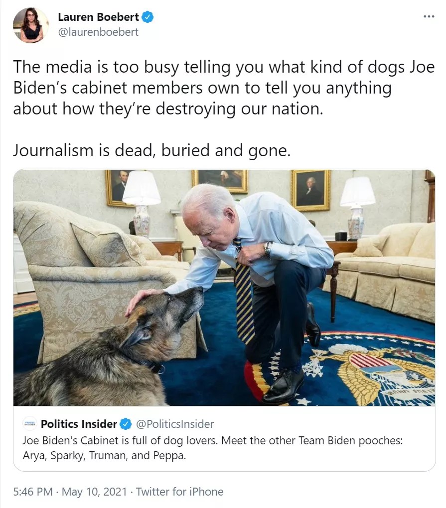 Despite the best efforts of the far right as led by Fox News, journalism is far from dead, let alone buried and gone. Sure, Boebert and those who would discredit America’s fourth estate can point to feel-good fluff pieces as proof of its imminent demise, but one of the media’s many roles in American lives is to provide inspiration. Here, that our president is a good man who cares for people and animals, and surrounds himself with the same sort of people. If this image threatens her – if she prefers the anger and bluster and basic incivility of Trumpian politics to this? That’s not uncovering something shitty about journalism. That’s offering up a peek at the deep, hateful rot that Boebert is covering up with that gun, that flag, that coiffed hair and toothy smile.