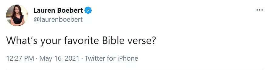 You have to wonder where the ideas now inside Boebert’s head come from. It’s one thing to be the sort of Christian who does and supports the exact opposite of what Jesus taught while placing the reasoning for their actions and beliefs firmly in the hands of the Bible. Hypocritical, annoying, crusade-inducing, all that. But most folks in this category at least have the decency to thump their Bibles in the relative safety of their own bubbles. Maybe Boebert learned a lesson here, since this post went viral, with most of the comments suggesting chapters and verses directly in opposition to her own stated political stances. Some turned the question back on her, which no doubt made her scramble to Google good Bible verses. She chose Isiah 8:18, a relatively safe pick. At least it wasn’t “two Corinthians,” which in the Trump Bible translates roughly to “I know nothing about the Bible, but I have one made of gold. Amen.”