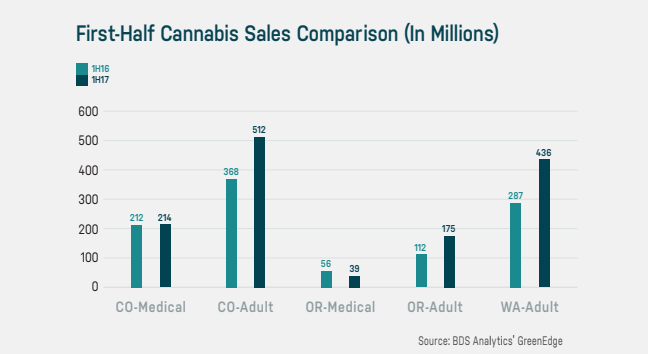 While much of that growth can be attributed to a new retail market in Nevada and more states legalizing medical marijuana, Colorado is still the biggest player in the industry. We generated more retail cannabis sales through the first half of 2017 than any other legalized state. The $512 million in recreational pot business that Colorado did during that span was more than 17 percent higher than Washington’s retail sales ($436 million) and over 190 percent higher than Oregon’s ($175 million). Figures are not available for Nevada, which opened retail dispensaries in July (and saw $27 million in sales that month).