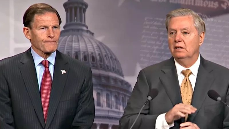 Senators Richard Blumenthal and Lindsey Graham announcing their original red flag bill in March 2018.