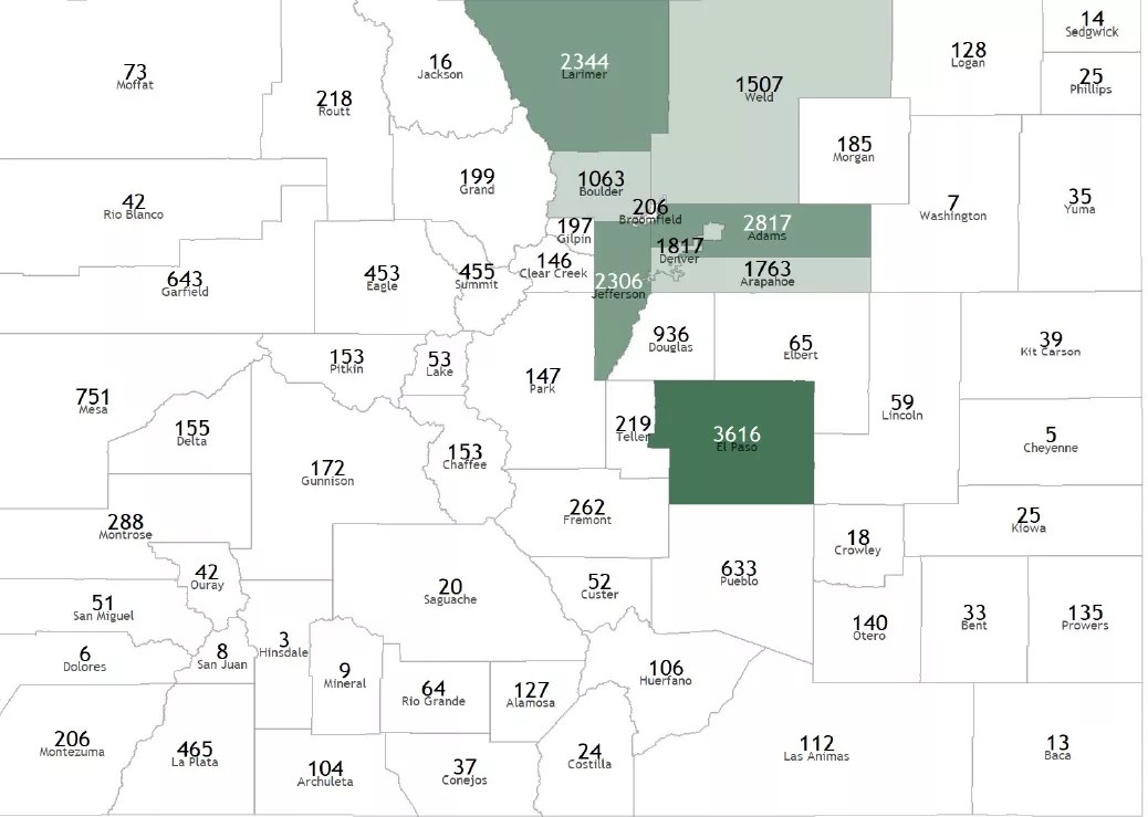 El Paso County had the most DUI filings, with 3,616, followed by Adams (2,817), Larimer (2,344), Jefferson (2,306), Denver (1,817) and Arapahoe (1,763). However, Gilpin, Kiowa, Huerfano, Clear Creek and Summit counties had the top rates for DUI case filings by population.
