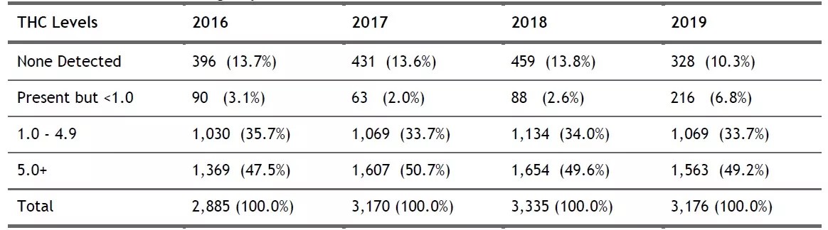 Even more telling is the breakdown of case filings and substances detected. Alcohol was found in 15,495 cases in 2016, 15,088 in 2017, 14,484 in 2018 and 13,900 in 2019. In contrast, Delta-9 THC was found in 2,489 cases in 2016, 2,739 in 2017, 2,900 in 2018 and 2,848 in 2019.
