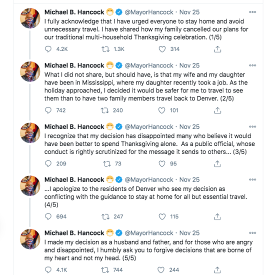 Surprisingly often, people making public apologies throw fresh tinder onto their own fire by trying to get smart, and end up patronizing as well as offending their audience. Case in point: Mayor Hancock’s tweets helpfully explained that he’d hopped on a plane because “it would be safer for me to travel to see them than to have two family members travel back to Denver.” Which is true. But gee, if only there was a third option. Something like, I dunno, staying home and hosting a virtual gathering, as he’d repeatedly urged the rest of the city to do.