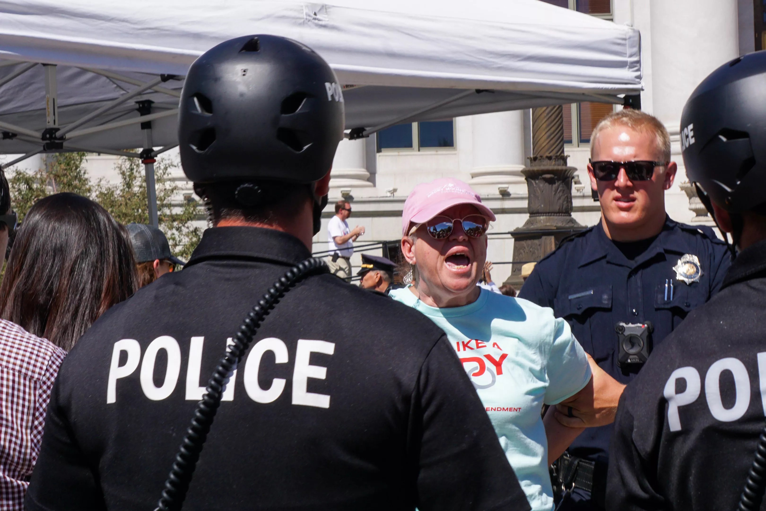 But when the audience stood to see Hancock take his oath, crowd members on stage left began yelling in protest. Within minutes, about seven or eight police officers arrived and pulled one of those protesters, 54-year-old Caryn Sodaro, out of the viewing area and into a police vehicle. Her companions, including former mayoral candidate Kalyn Rose Heffernan, insisted that Sodaro hadn’t been doing anything different than they had, and were confused by her arrest. Denver Police Department later sent Westword an arrest affidavit which noted she had been standing in a fenced-off area and thus was “disrupting lawful assembly.”