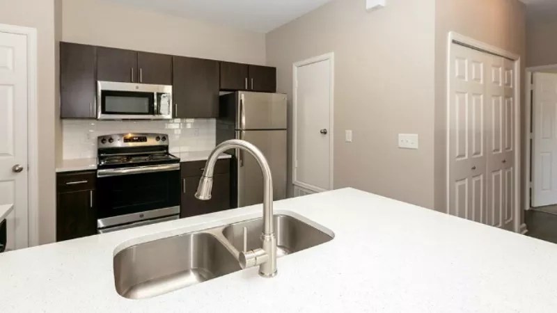 The kitchen and dining areas in the Aurora one-bedroom highlighted in the photo at the top of this post.