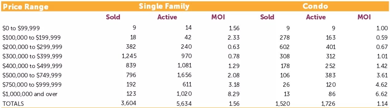 At the upper end, 123 homes had a purchase price of more than $1 million in August, and thirteen condos went for at least that much. But there’s no shortage of inventory in that category: 1,020 houses and 86 condos are listed in the seven-figure range.
