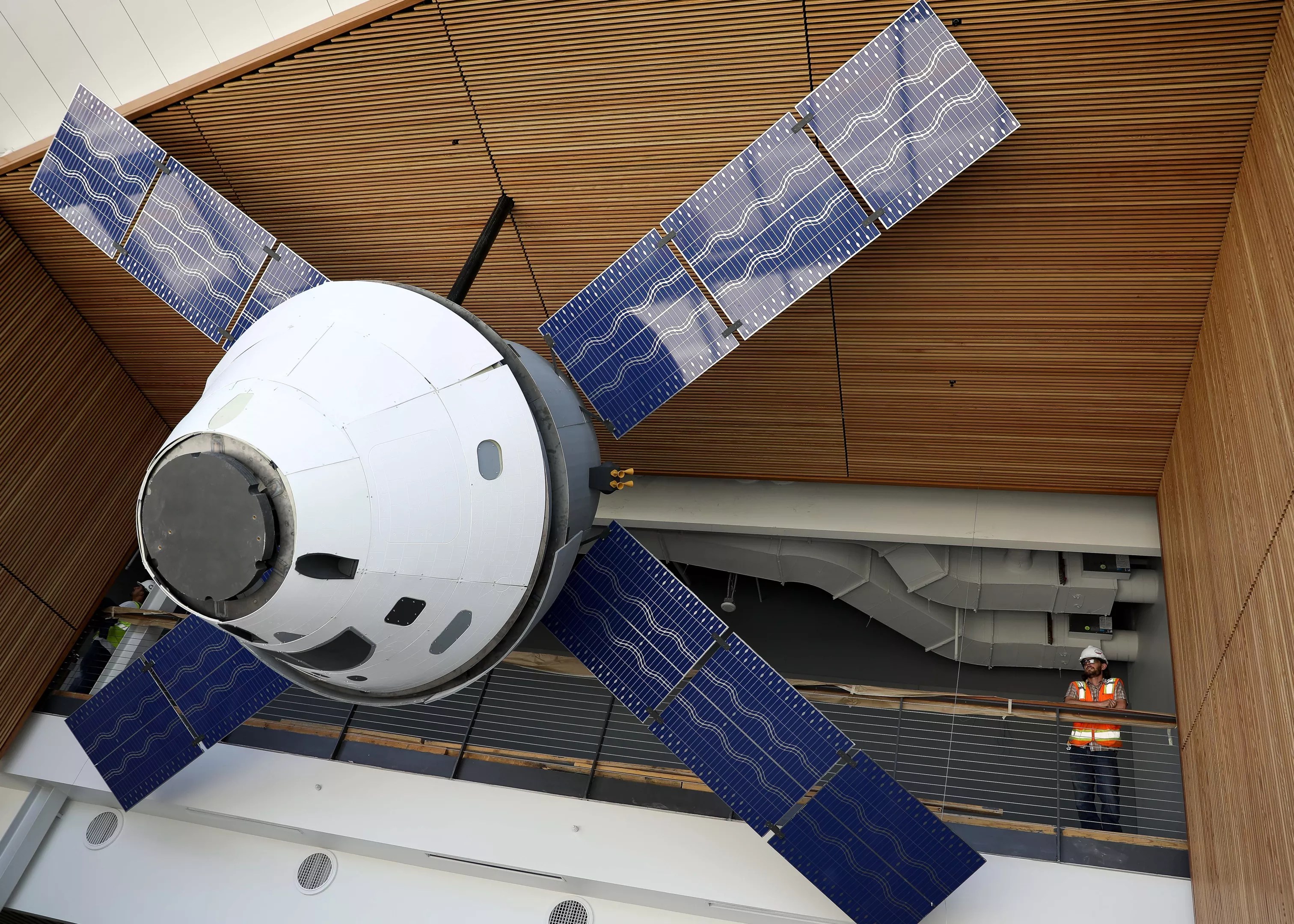A student-made 50 percent replica of Lockheed Martin’s Orion Spacecraft hangs in the AES building.