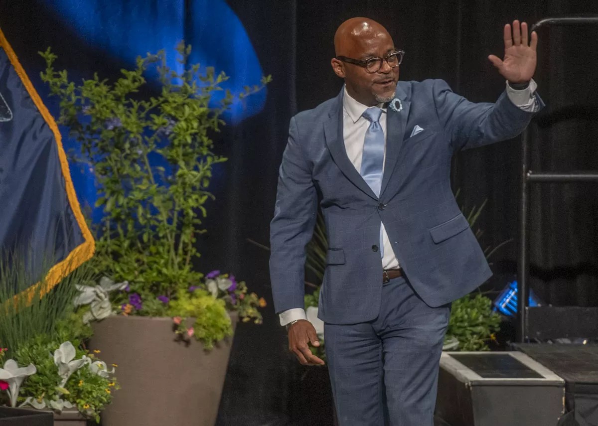 Michael Hancock, who’s leaving City Hall after three terms as mayor and two on city council, received a standing ovation and a hug from Johnston, who seemed eager to start his new job and ended his speech with “Now, let’s get to work!”