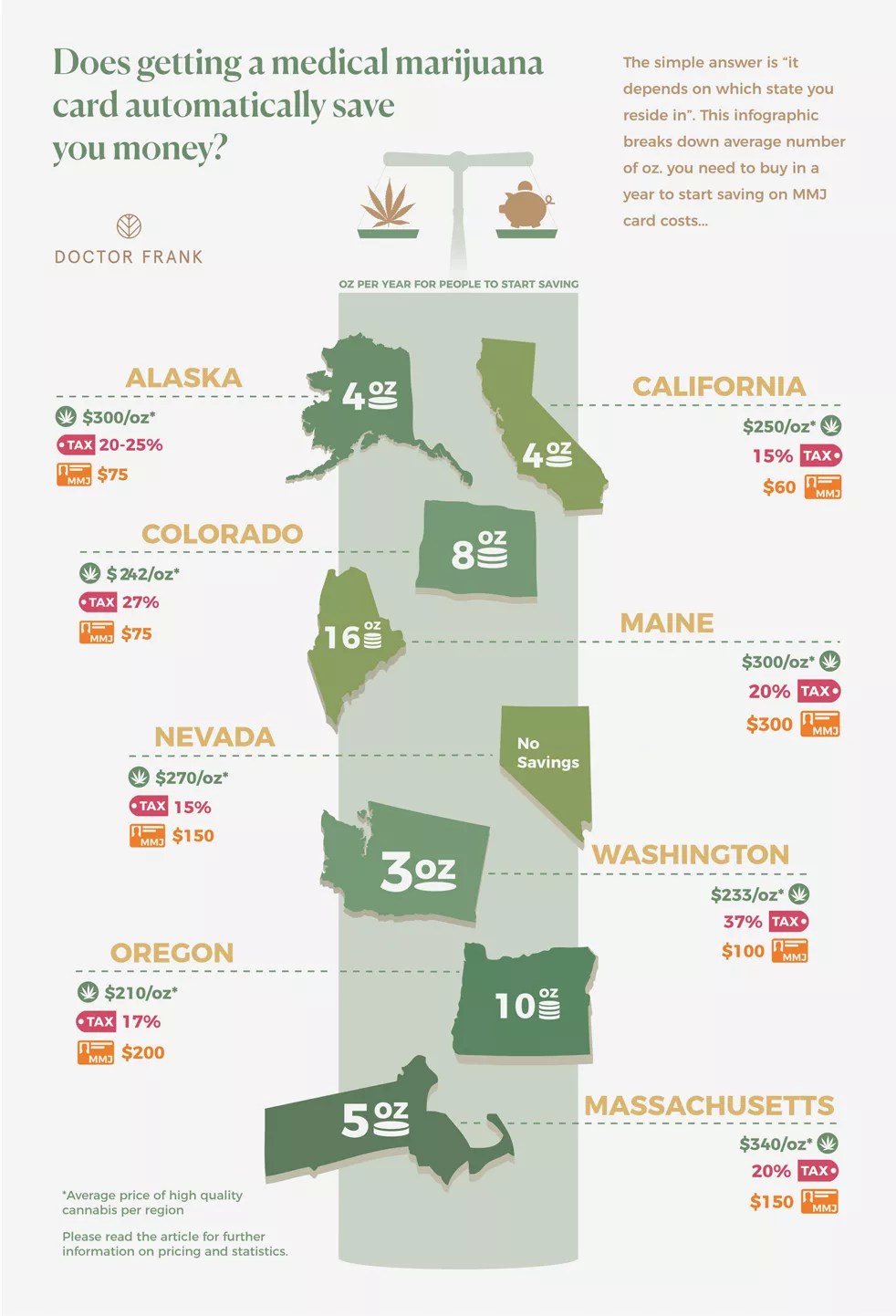 The Doctor Frank study took the average price per ounce of flower and measured how many ounces a patient would have to buy to save money after the initial investment of getting a medical card. It included all eight states that have legalized retail marijuana: Alaska, California, Colorado, Maine, Massachusetts, Nevada, Oregon and Washington. Here are the study results: