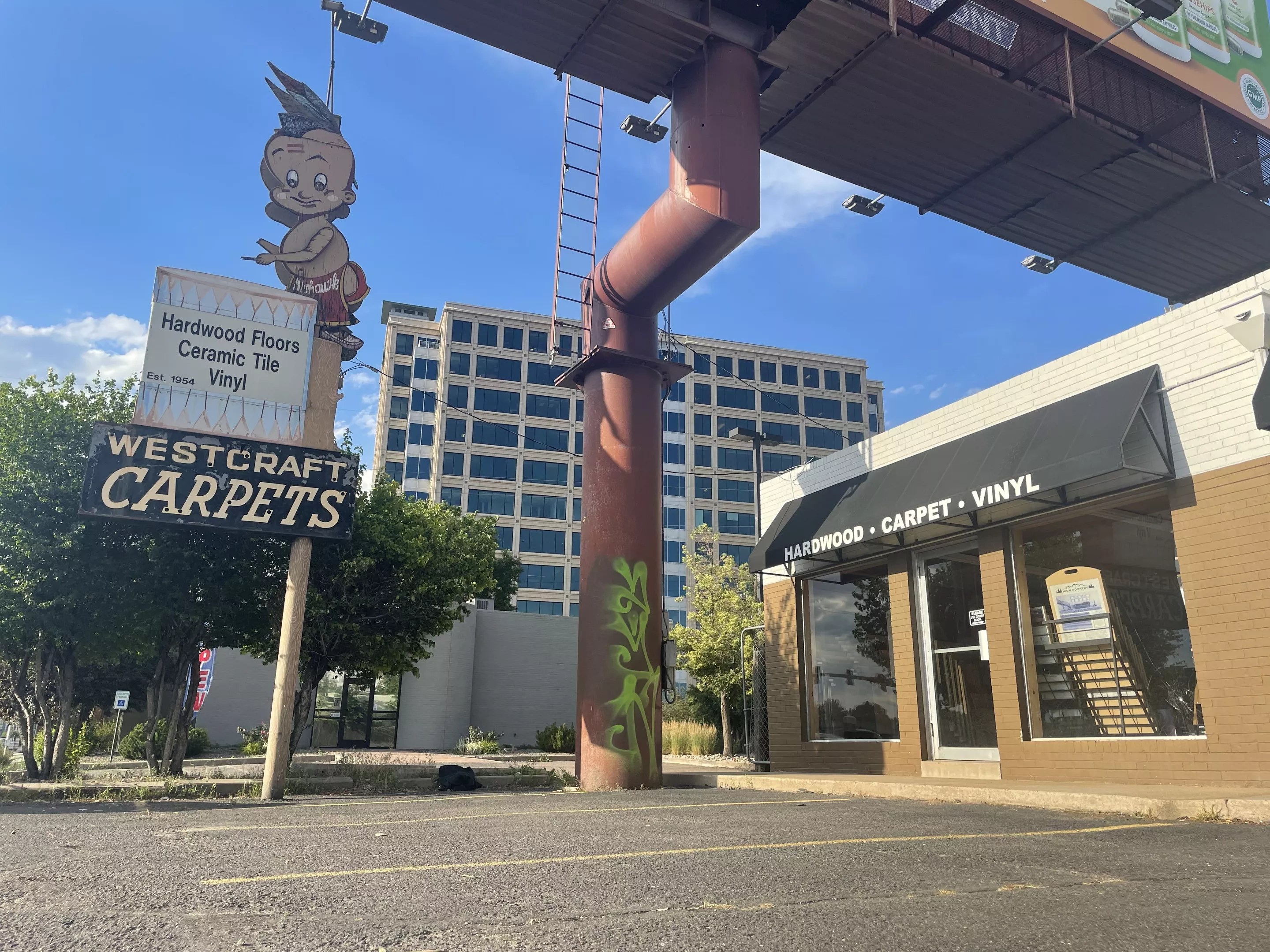 Mohawk Tommy, a shirtless boy sporting a mohawk haircut with a feather in back, was a 1950s Walt Disney Company cartoon creation that Mohawk Carpets – now Mohawk Industries – used in its advertising. You can still see the figure in dolls, drawings and even rugs available on eBay…and on that sign on South Colorado Boulevard.