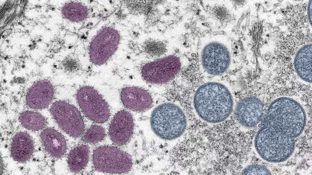 A colorized Centers for Disease Control and Prevention image of monkeypox.