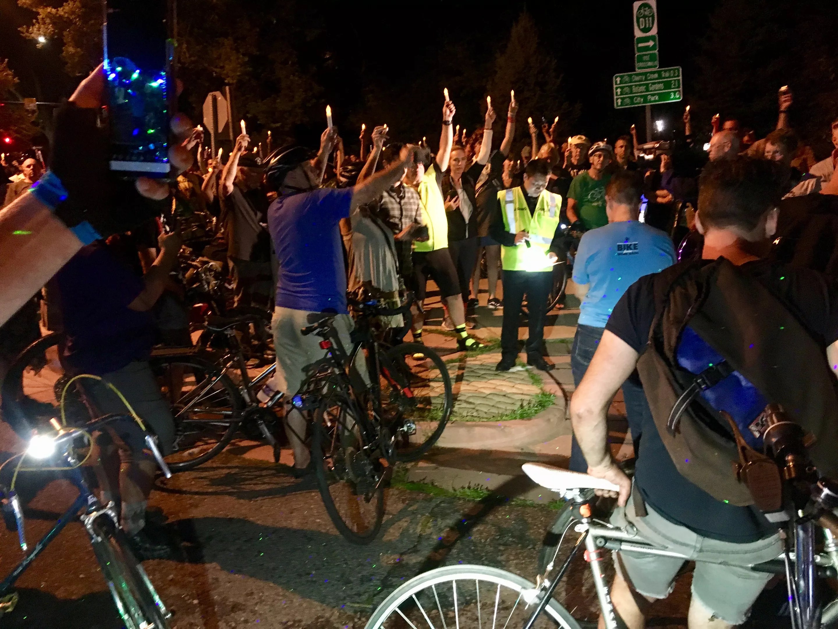Thirty minutes of pedaling in, during which time one pedicab blasted the Doors’ “Riders on the Storm” to match the night’s rainy conditions, the Denver Cruiser Ride arrived en masse at the intersection of South Marion Street Parkway and East Bayaud Avenue, an area just south of the Denver Country Club. There, the mood turned somber. Battery-powered LED candles appeared like bobbing beacons, held aloft by scores of cyclists.
