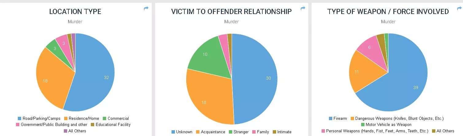 Of the 58 murders, eighteen are said to have been committed by an acquaintance of the victim, while two others were slain by a family member and one by someone defined as an “intimate.” But in thirty instances, the relationship remained “unknown,” and people defined as a “stranger” were responsible for ten.