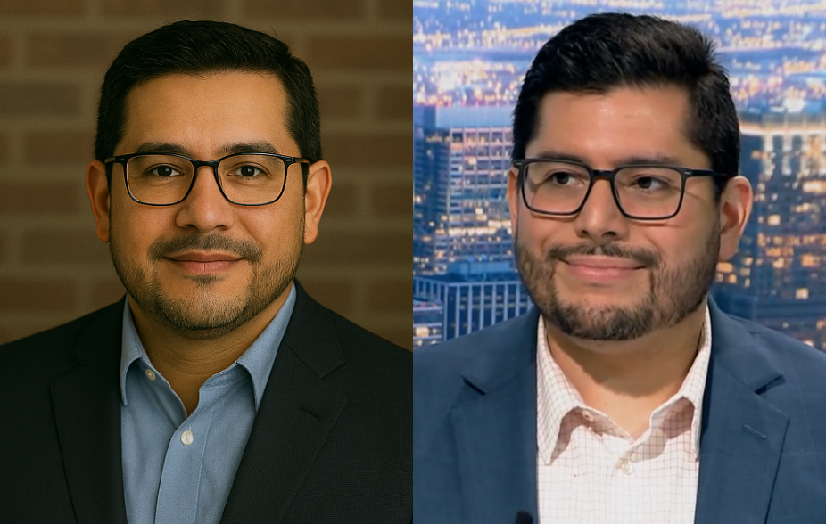 The presumably AI-generated image of “Carlos Ramirez” on Thomas’s campaign website, vs Carlos Ramirez-Rosa during a news interview.