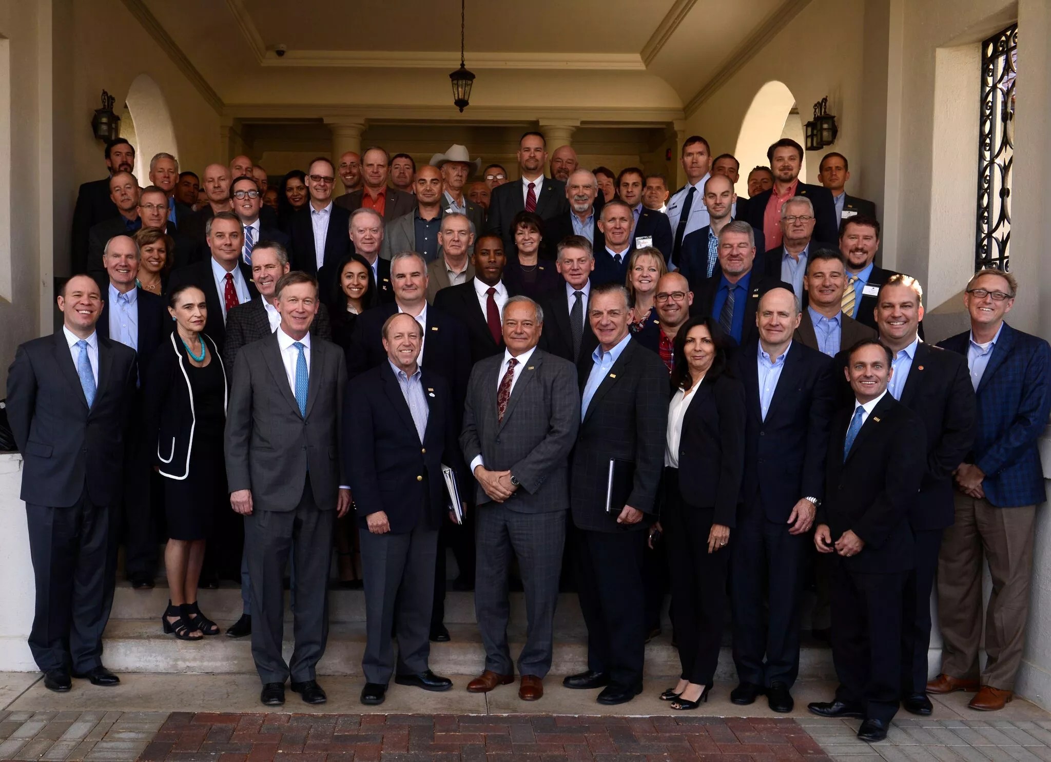 Colorado Springs Mayor John Suthers stands between Governor John Hickenlooper and NCC head Ed Rios (front, center) at the 2016 Governor’s Cyber Symposium.