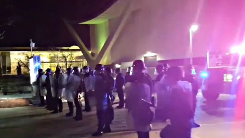 CSU police officers lined up outside the student center where the speech took place and drummed on their shields with their batons.