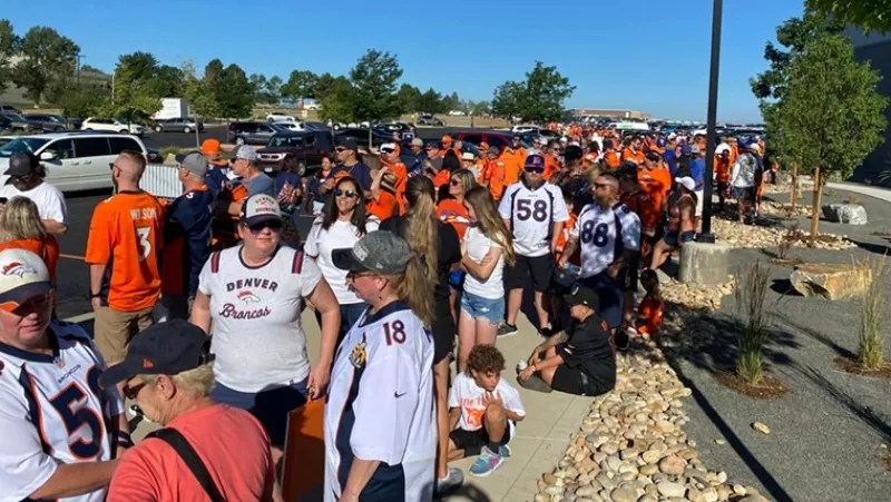 This was news to both of us – even Lora, who closely follows the Broncos on every social-media platform. Just to make sure she hadn’t missed something, she went over every tweet sent out by the team in recent days and found nothing about tickets. A woman charged with directing fans with and without tickets to the proper lines told us she’d seen something about the requirement on TV news broadcasts, which Lora noted was a good way to reach people over fifty who still regularly tune in to such programs, and also to miss millennials who get their information from alternative sources.
