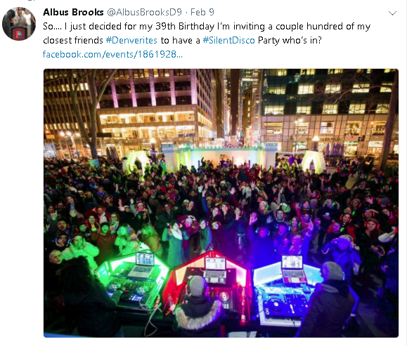 “So…. I just decided for my 39th Birthday I’m inviting a couple hundred of my closest friends #Denverites to have a #SilentDisco Party who’s in?”