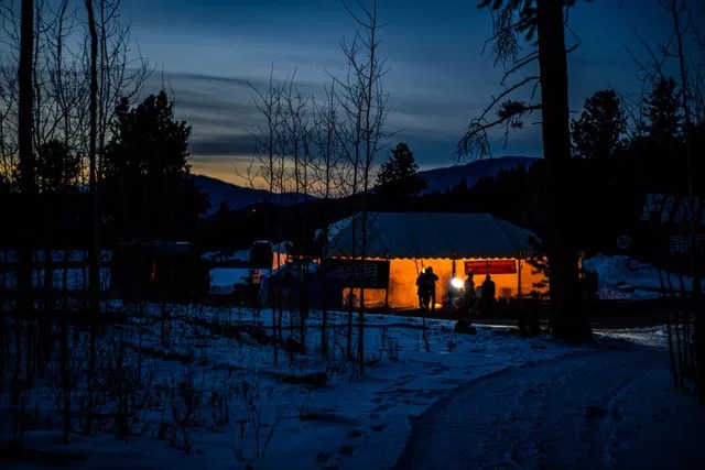 At night, the hospitality tent and runners’ headlamps provide the only night.