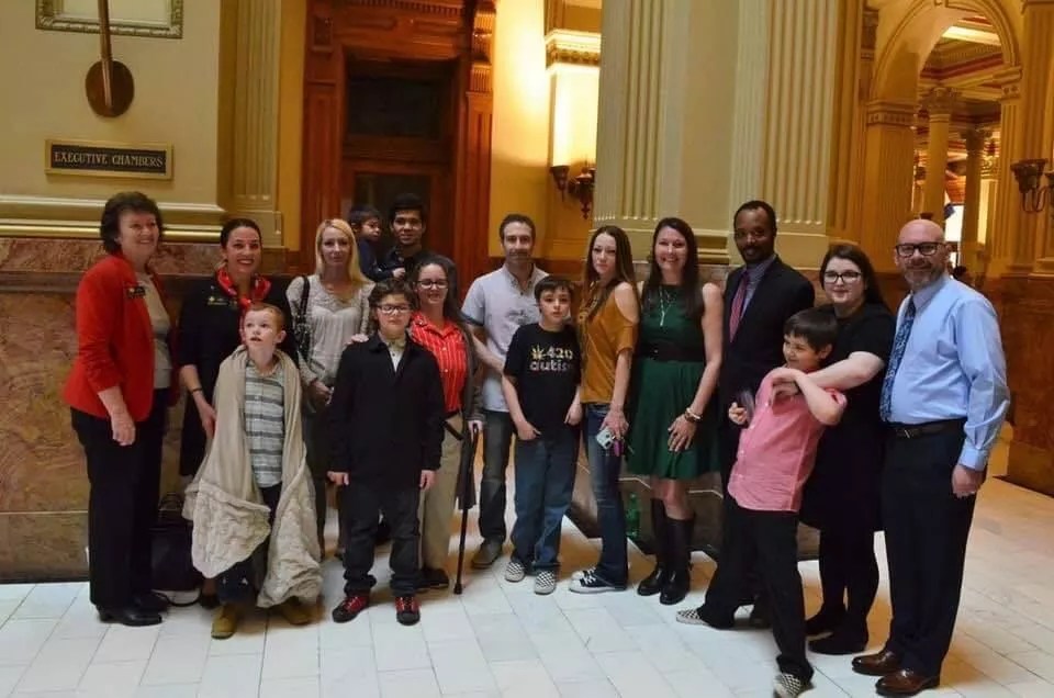 Autumn Brooks (middle row, fourth from left) and Michelle Walker (second from right) pose with their sons for a group photo at the State Capitol in 2019.