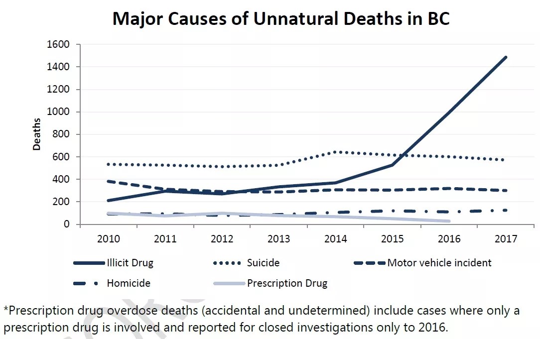 The OD death toll is even greater in Vancouver’s province, British Columbia. As you can see by another City of Vancouver graphic, casualty rates from suicide, homicide, motor-vehicle accidents and prescription-drug abuse have remained relatively steady in BC since 2010. But deaths related to illicit drug use have taken an enormous leap, especially in 2015 and subsequent years.