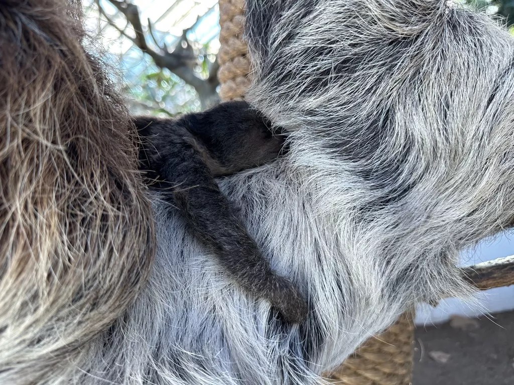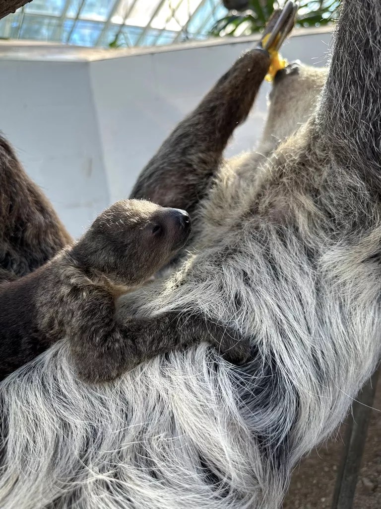 The baby sloth nestles into mom, Charlotte, in the Tropical Discovery building at the Denver Zoo.