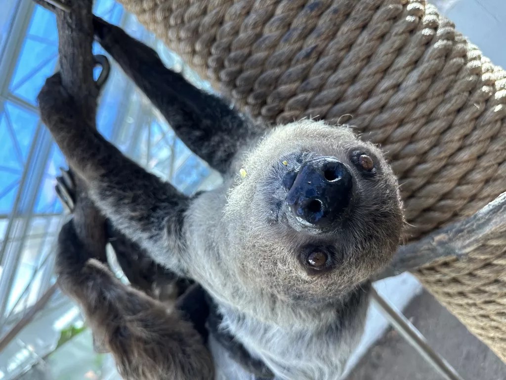 Charlotte keeps an eye out for more snacks of pear and corn on the cob inside the sloth exhibit at Denver Zoo.