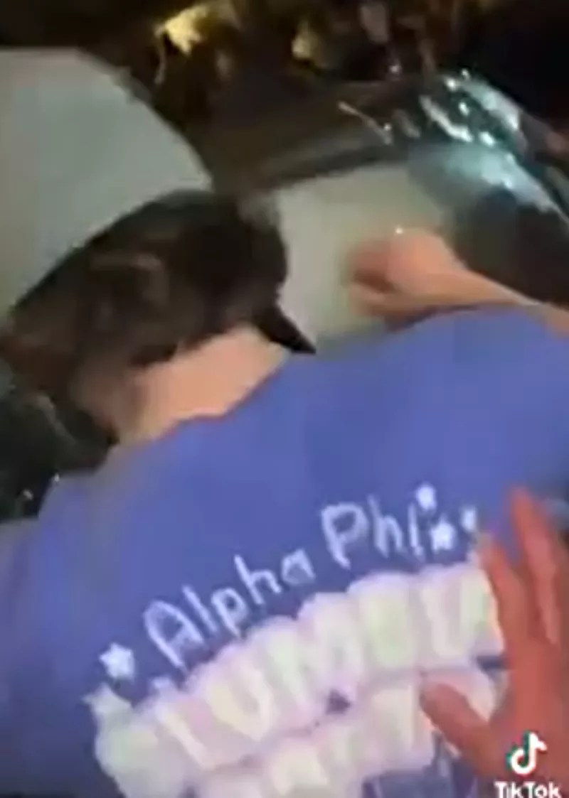 One person is seen wearing a fraternity T-shirt.