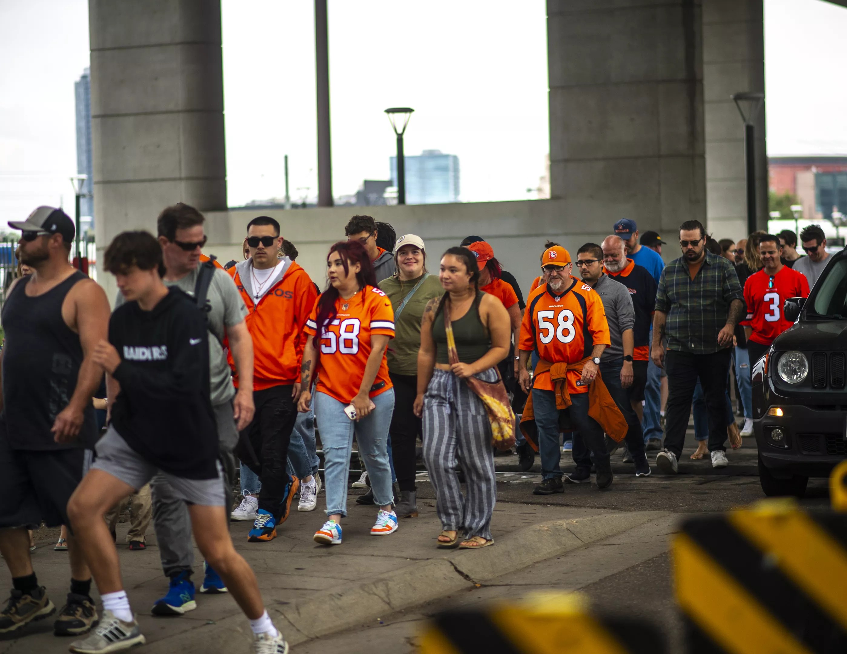 Hundreds of fans cross the railroad tracks under the I-25 bridge near the Metro State campus.