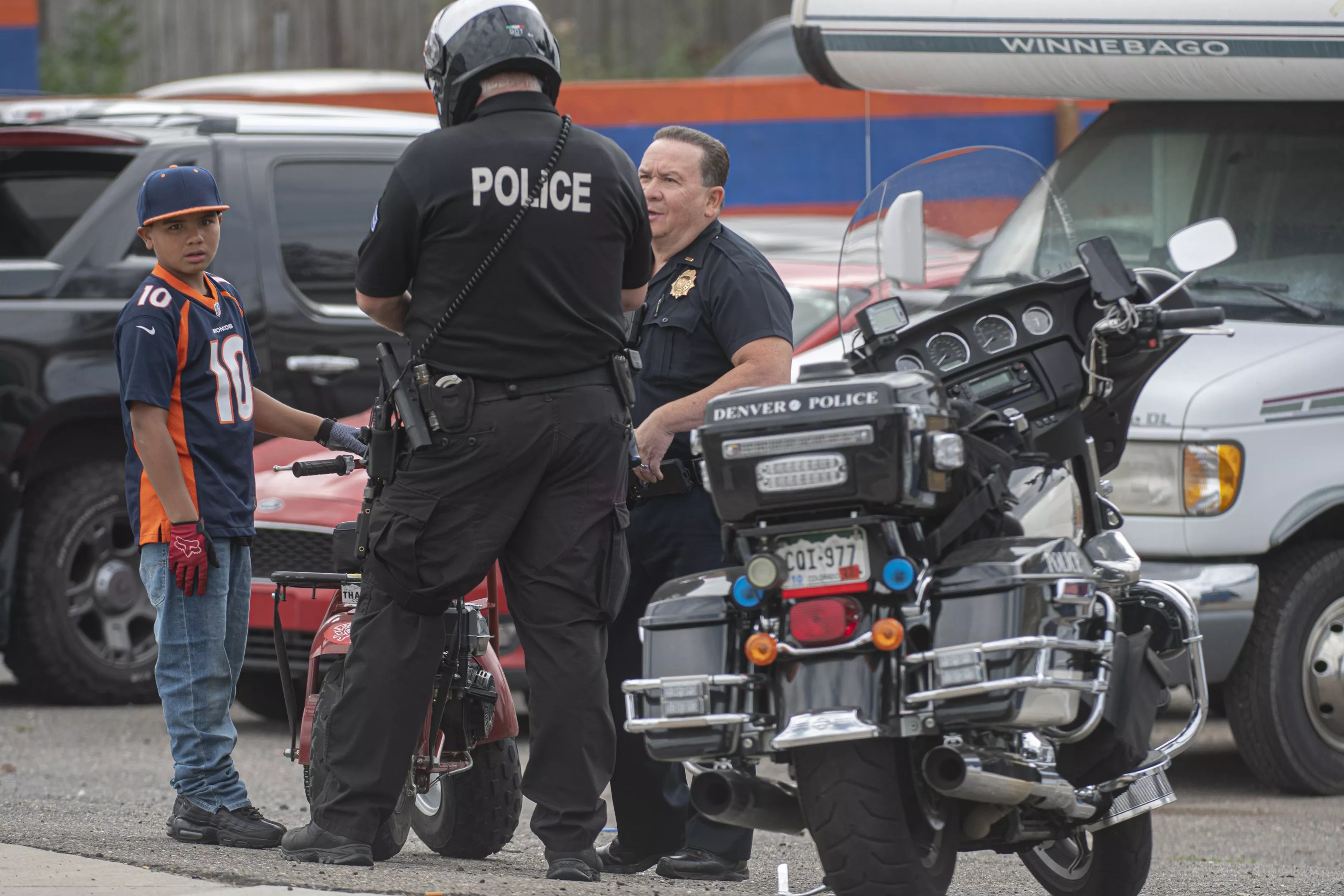 A young boy wearing a Broncos Jerry Jeudy chats with officers on his way to the game.