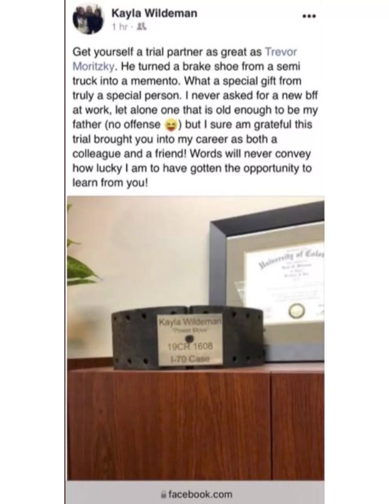 “Get yourself a trial partner as great as Trevor Moritzky. He turned a brake shoe from a semi truck into a memento. What a special gift from truly a special person,” Kayla Wildeman, a prosecutor with the District Attorney’s Office for the First Judicial District who was involved in the case, wrote on Facebook above a photo that shows a brake next to a diploma. “I sure am grateful this trial brought you into my career as both a colleague and a friend! Words will never convey how lucky I am to have gotten the opportunity to learn from you!”