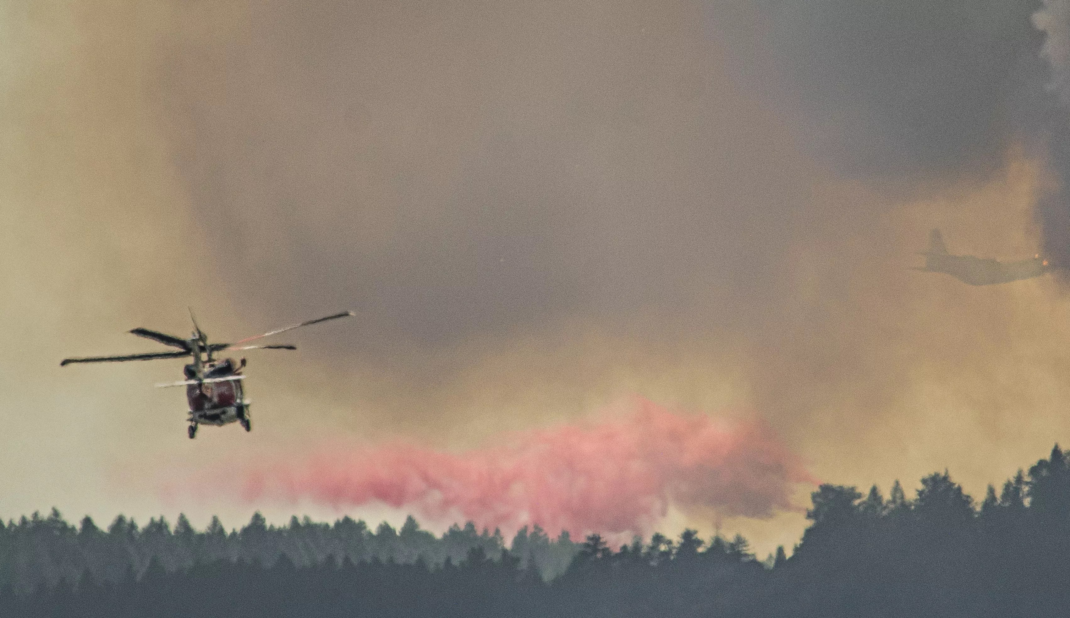 A helicopter prepares to dump more water after an air tanker flies over Deer Creek Canyon.