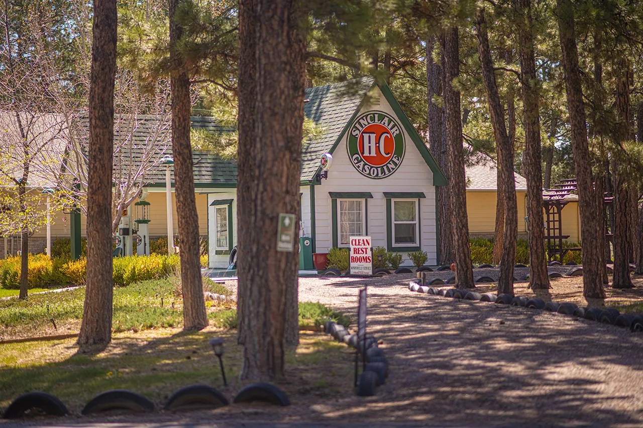 A re-created Sinclair Gasoline station doubles as a gift shop.