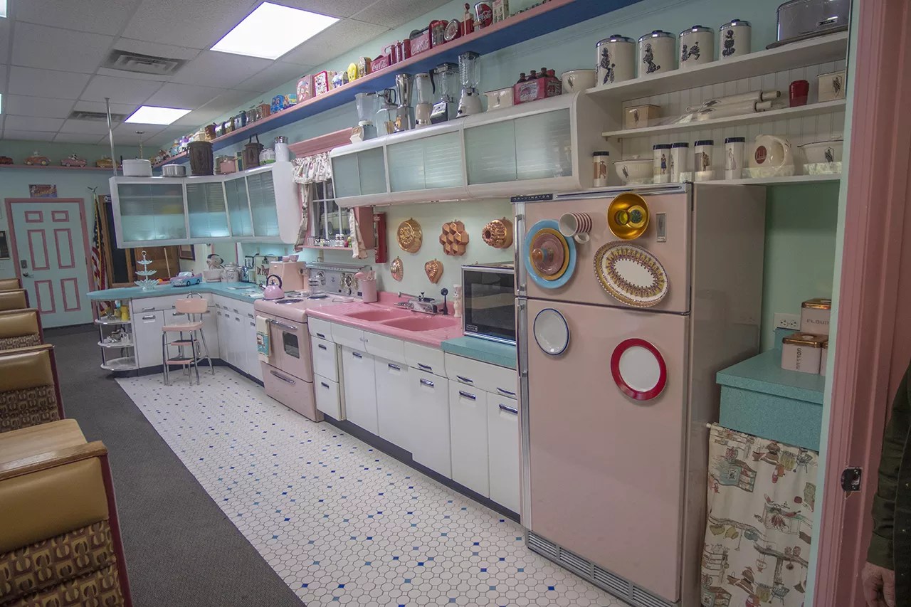 Inside the re-created ’60s diner and kitchen at Rambler Ranch, which features Kelvinator appliances and collectibles given to Terry Gale from older friends over the years.