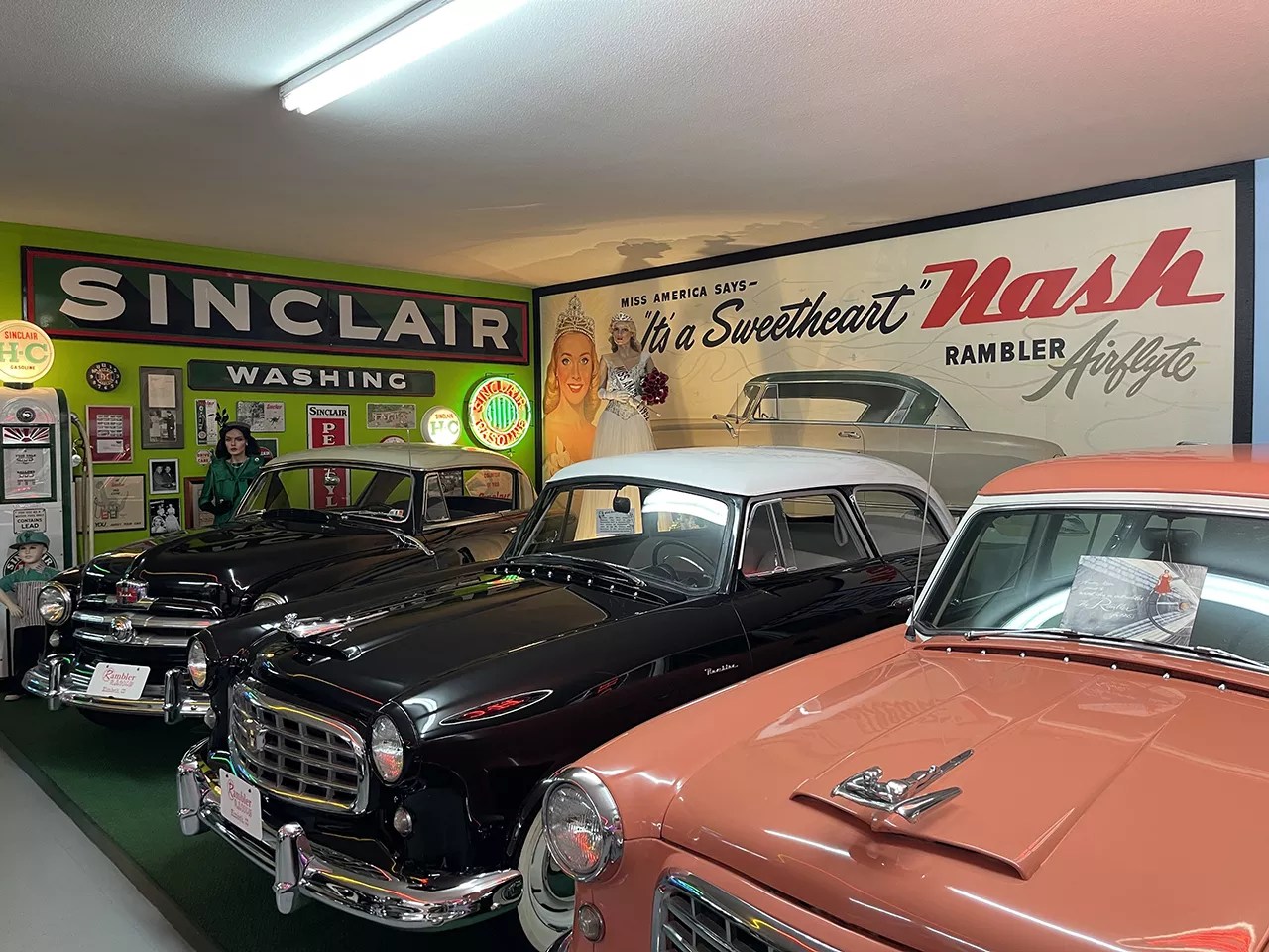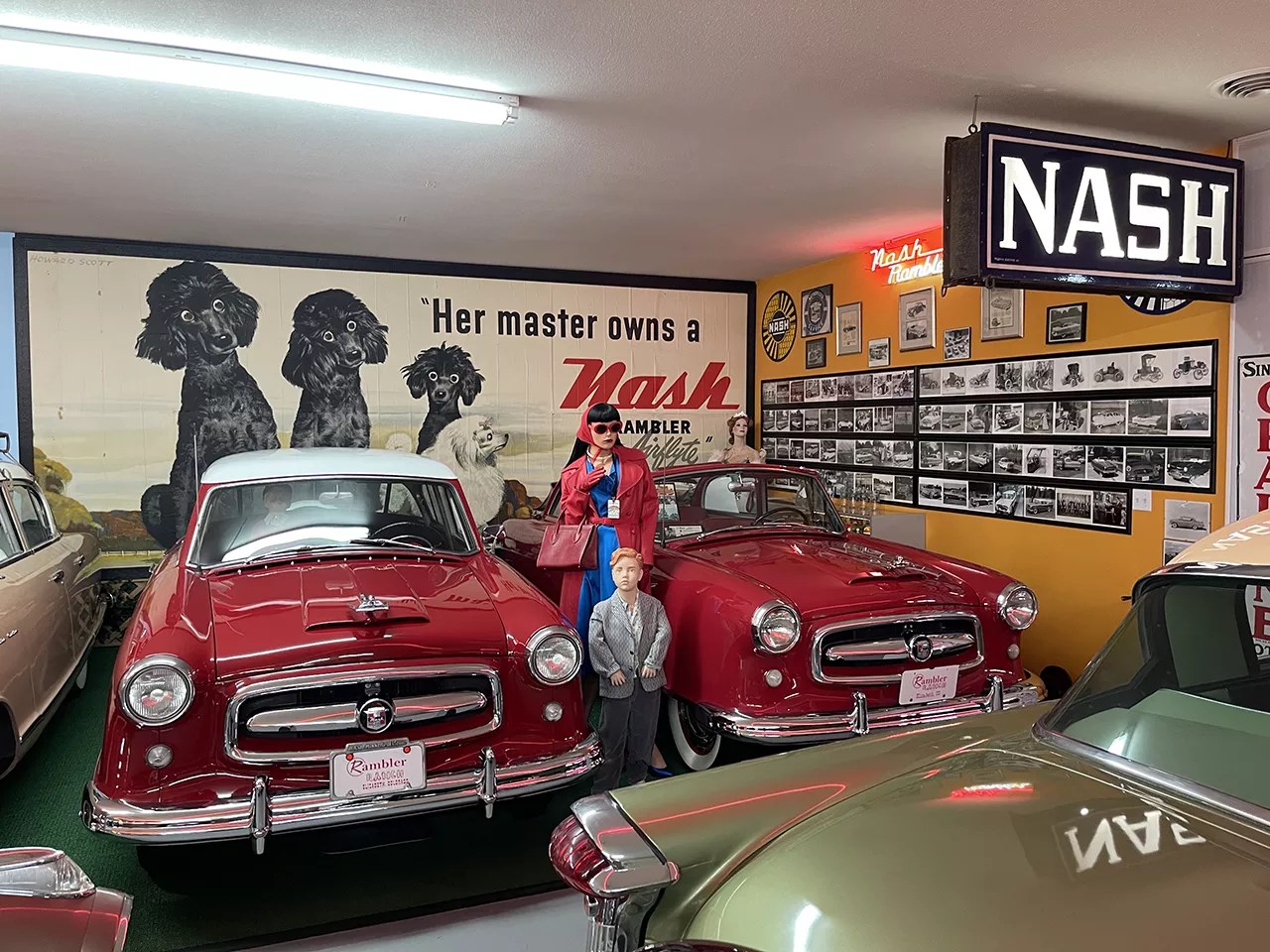 Inside Rambler Ranch’s “Nash” building, with dozens of restored cars and collectibles — including the dress worn by Colleen Kay Hutchins, Miss America 1952, in advertisements for Nash Motors.