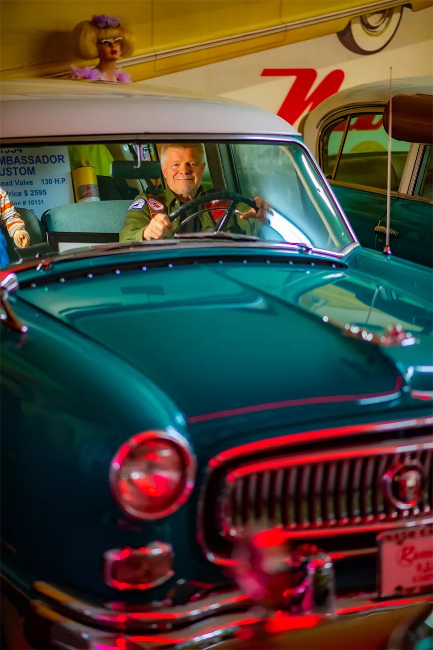 Terry Gale behind the wheel of his late father’s Nash Ambassador, the first car in the collection.