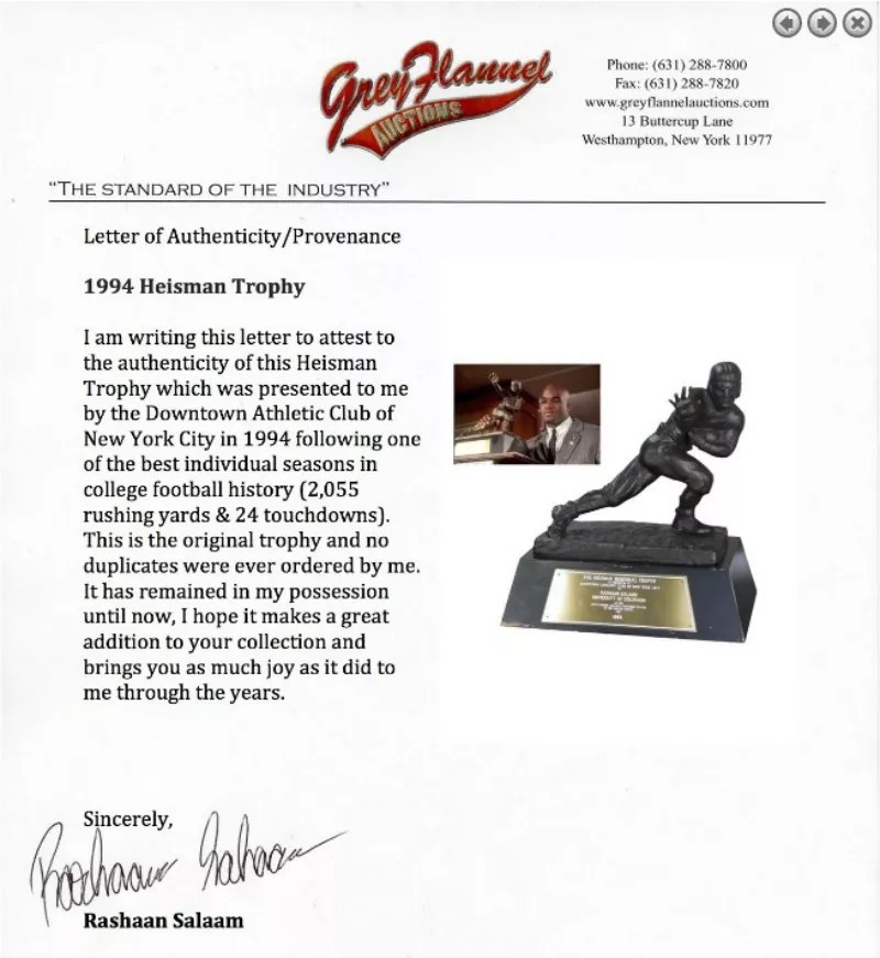 Bidding for Salaam’s Heisman continues through January 20, and organizers think it could go for as much as $300,000.