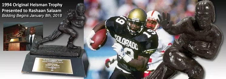 The 1994 Heisman Trophy won by CU Boulder running back Rashaan Salaam, who killed himself in a Boulder park circa December 2016, has been sold at auction for $399,608.40. This total is reportedly the most ever for a Heisman, topping the cash paid for O.J. Simpson's, among others. A likely reason for the high price was its now-former owner's pledge to donate a significant portion of the windfall to research of CTE, a brain disease common among NFL players from which Salaam may have suffered.