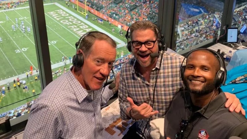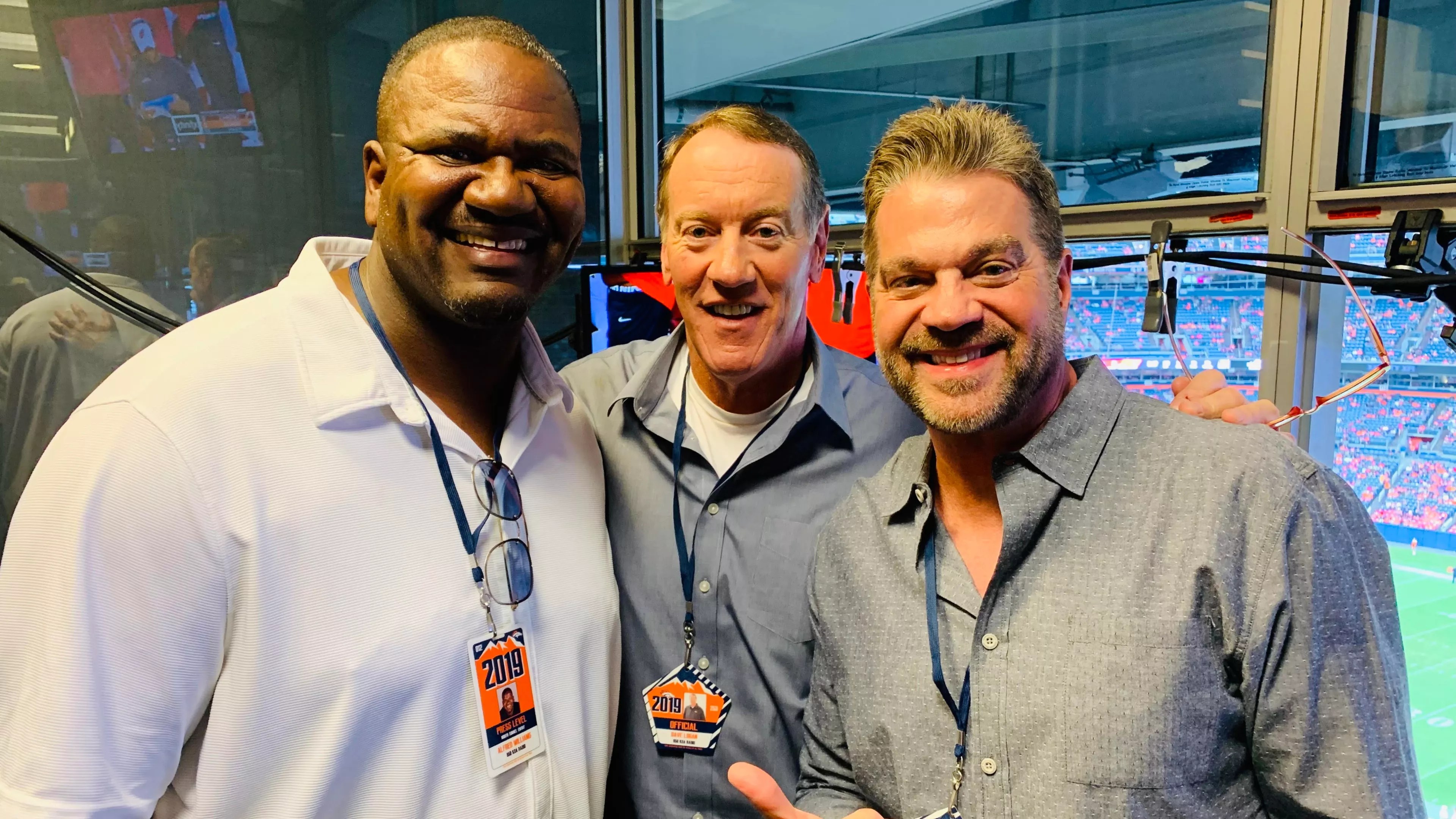 Dave Logan and Rick Lewis joined at a Broncos broadcast by Hall of Famer Champ Bailey.