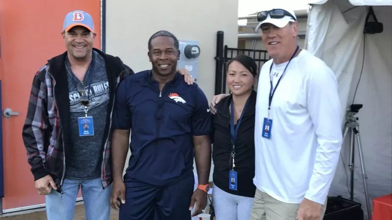 Rick Lewis, Kathy Lee and Dave Logan with Denver Broncos head coach Vance Joseph.