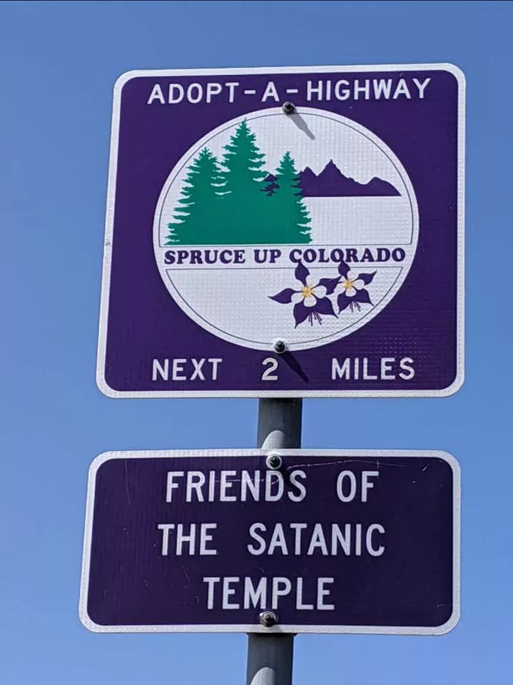 Drive on Colorado Highway 128 in Broomfield at just the right time, and you’ll notice a group of people picking up trash from the side of the road by the grassy plains of the Rocky Flats National Wildlife Refuge. Pump your brakes, and you might also catch the wording of a purple road sign as you whiz by: “Adopt-a-Highway-Next Two Miles-Friends of the Satanic Temple.”