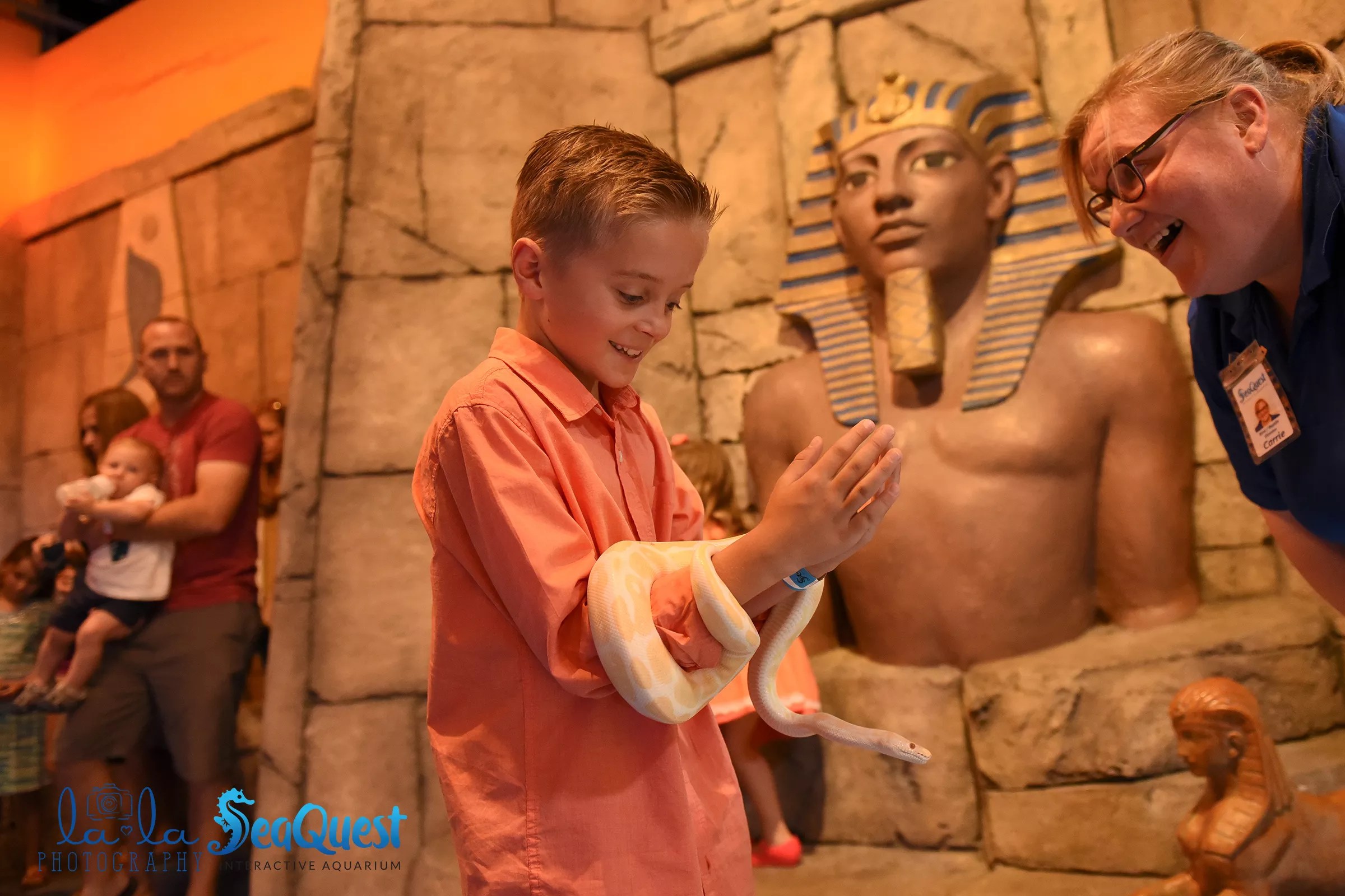 A boy holds a snake at an Ancient Egypt-themed exhibit at SeaQuest.