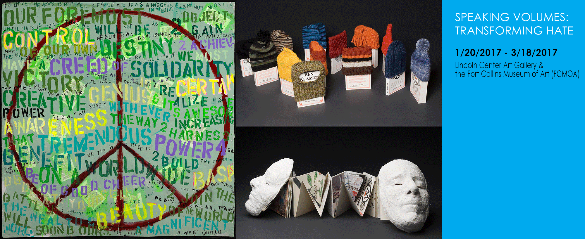 Speaking Volumes: Transforming Hate , showcasing the diverse work of 39 artists who have transformed thousands of anti-Semitic and racist books into a visually powerful, thought-provoking and deeply moving exhibition sponsored by the Montana Human Rights Network, is in its final week in Fort Collins. Special events include: