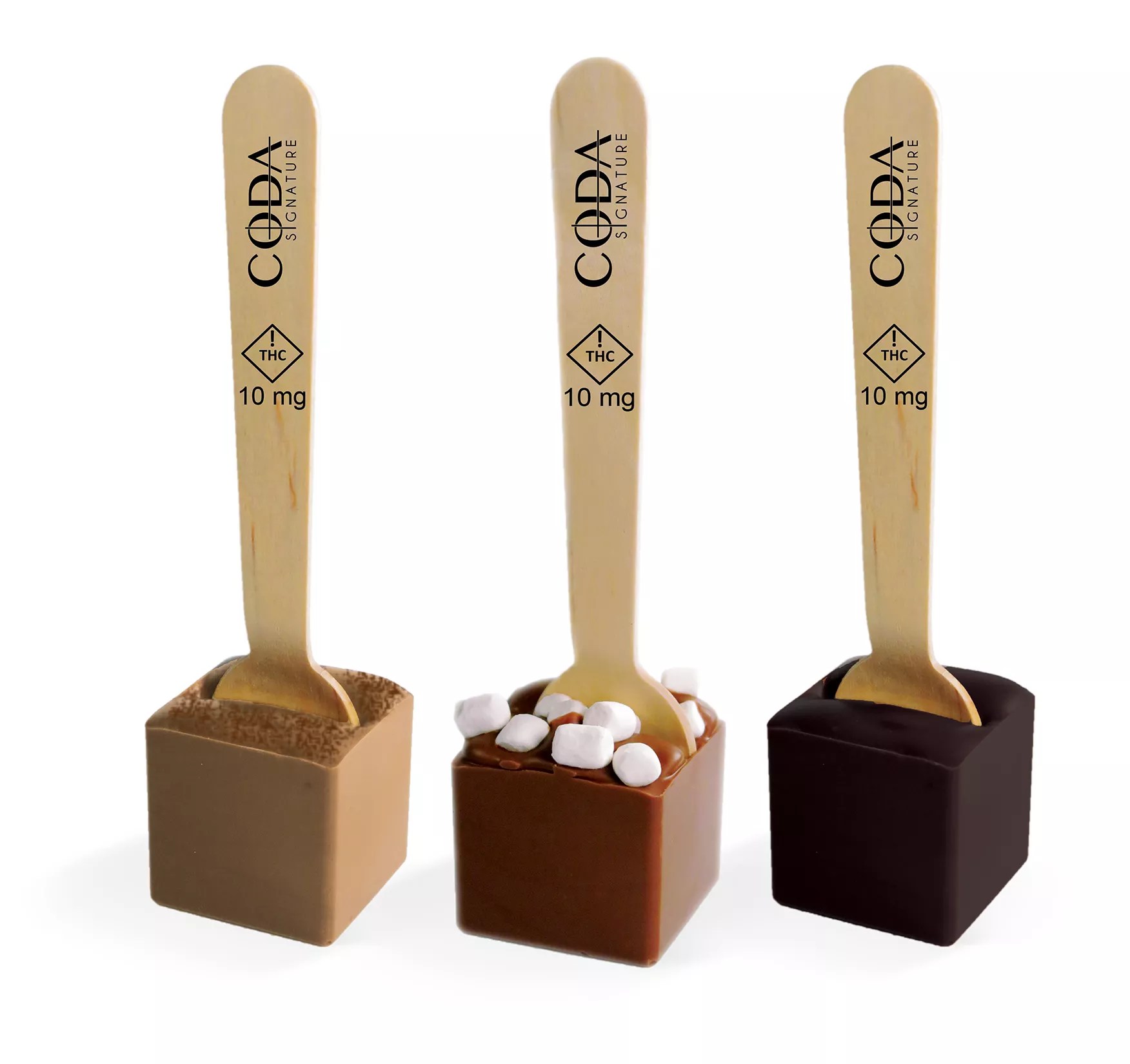 Coda Signature has dark, chai and marshmallow versions of its hot chocolate on a spoon,