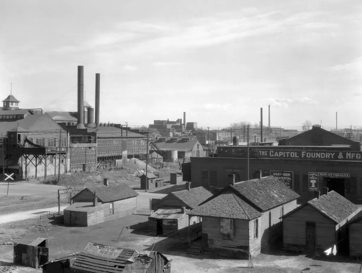 When Jewish immigrants settled in Sun Valley in the late 1880s, Colfax Avenue – which was also known as the Golden Road – delineated the border of the then-booming community. The area to the south was filled with small homes and businesses, including both factories and farms. Sun Valley had a school, a synagogue, markets, a smokehouse, a bakery, a recreation center and a fishmonger, as well as a brick factory, a pickle factory, a rag shop and a power plant. In 1917, a viaduct for cars and streetcars was constructed above Colfax, connecting downtown Denver and the westside neighborhoods. In the 1920s, when the City of Denver passed its first zoning code, it designated Sun Valley, particularly the area around the South Platte River, as an industrial zone.