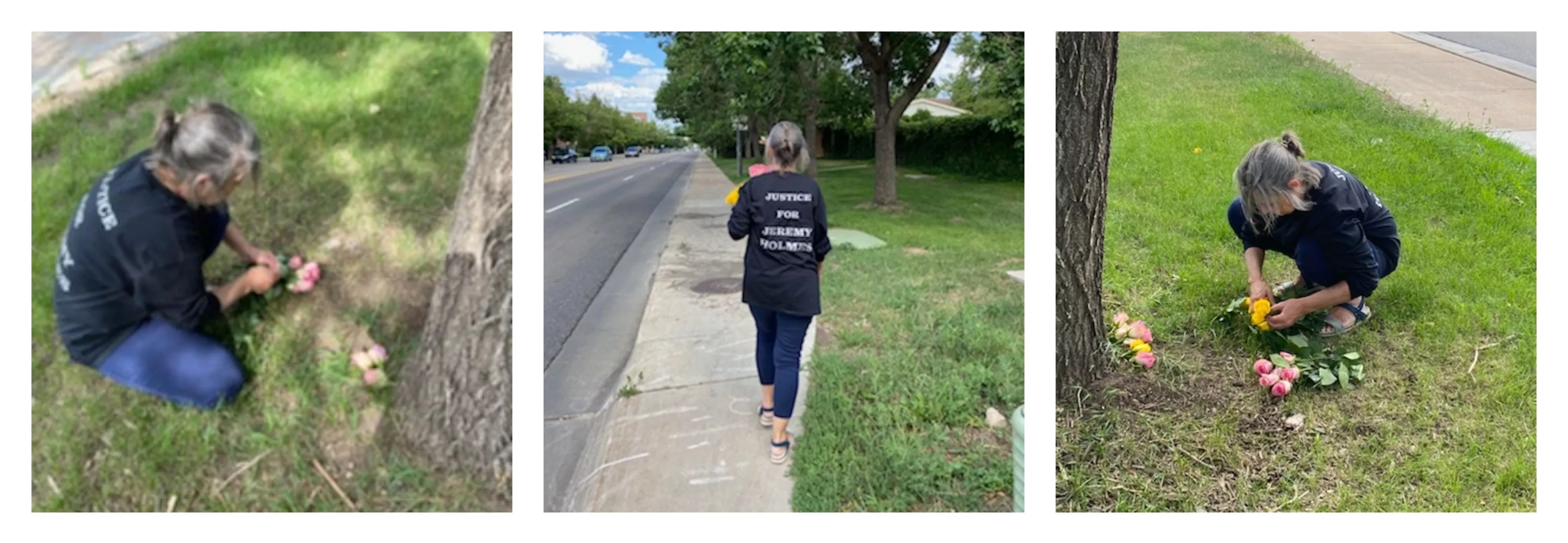 While in Colorado, Holmes visited the spot where Jeremy had died – a location she knew very well. “His blood was there for months,” she says, “and I kept seeing it, because I went there every single day. I took roses every day for months, since it was the only thing I could do to deal with the pain. I also put a statue of Buddha there and planted a bush, and a lot of people who actually heard the shooting came to memorialize Jeremy with little electric candles they put by the tree where he bled out. The coroner’s report said he lost almost all of his blood at that site.”