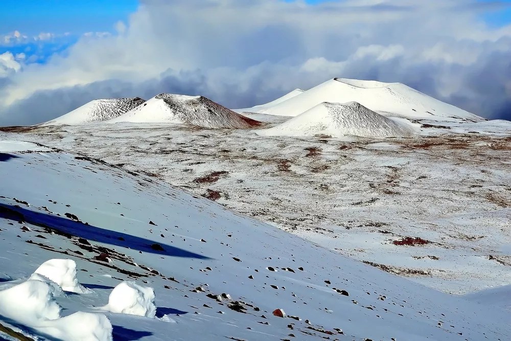 The tops of Mauna Kea and Mauna Loa, the Big Island’s twin volcanic peaks, received a not-so-unusual healthy snowfall a few weeks back, totaling around six inches.