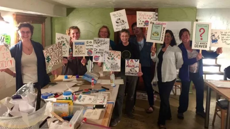 Demonstrators from the Indivisible Denver CD1 group getting ready for the recent Tax March.