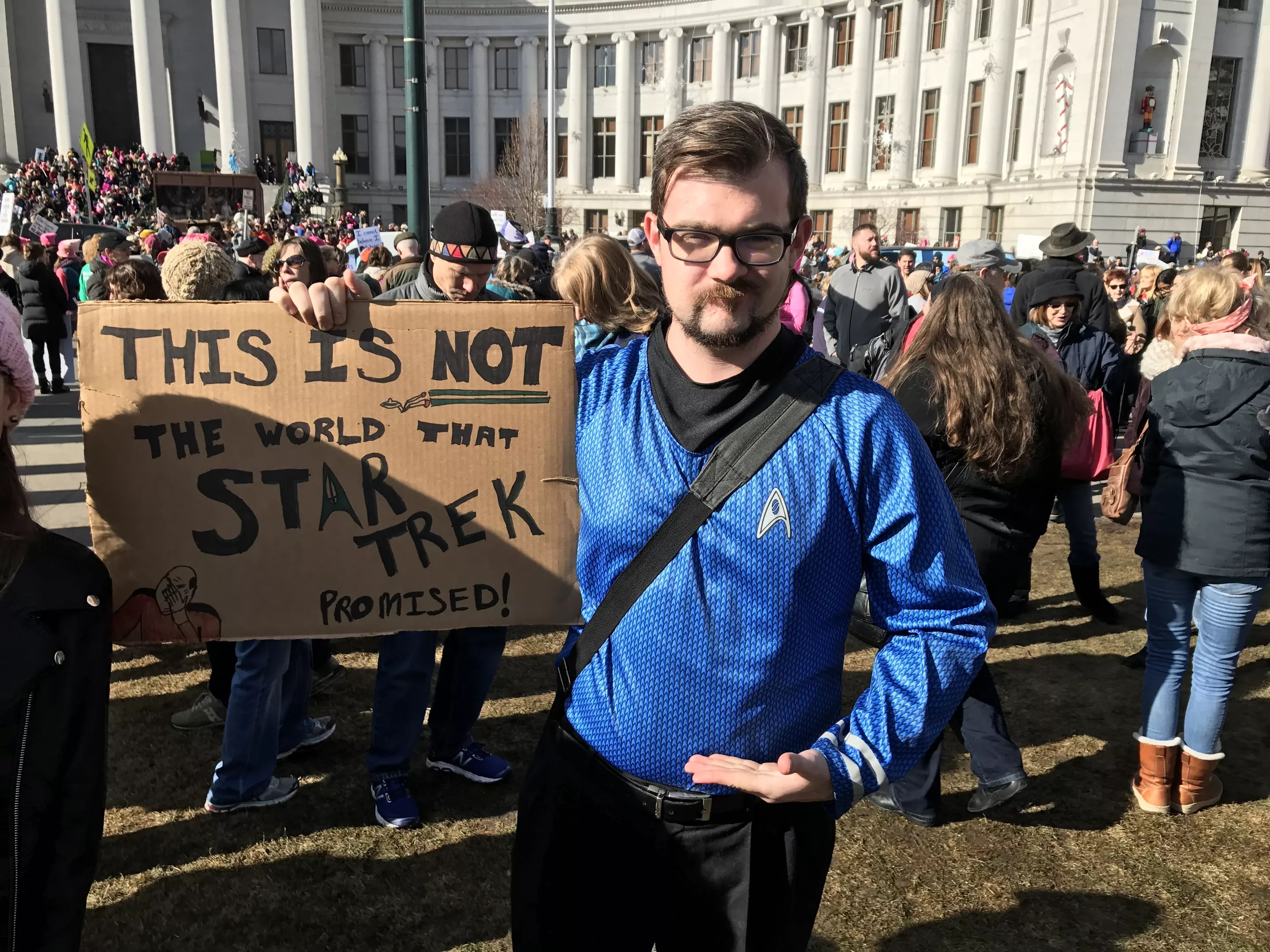 The only Trek-related sign we found at the Women’s March, this one refers to the failure (so far) of the real world to live up to the expectations of Gene Roddenberry and the Trek ethos, in which the racial, religious, gender and all other divisions are, by the time of Trek‘s future, made moot. The shirt was a nice touch, and it’s a good sign for the safety of the event that it was blue and not red.