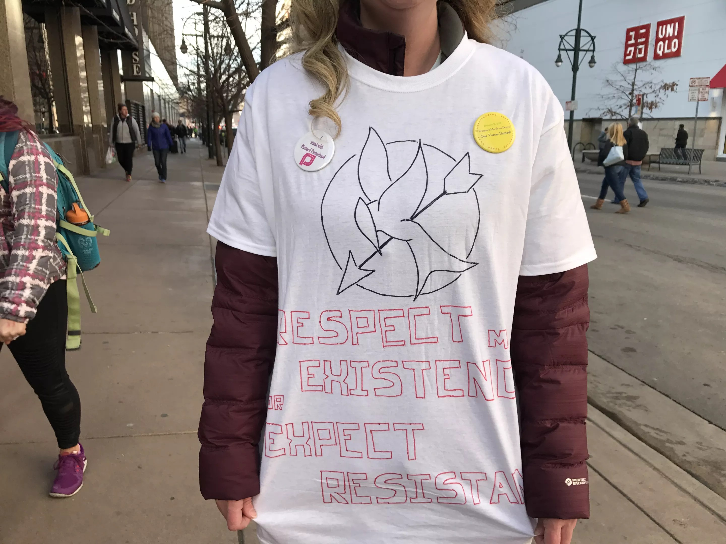 The text isn’t from Hunger Games (though it was on a number of other signs and shirts throughout Saturday’s protest), but that Mockingjay symbol certainly is, and like Star Wars, Hunger Games is all about rebellion.